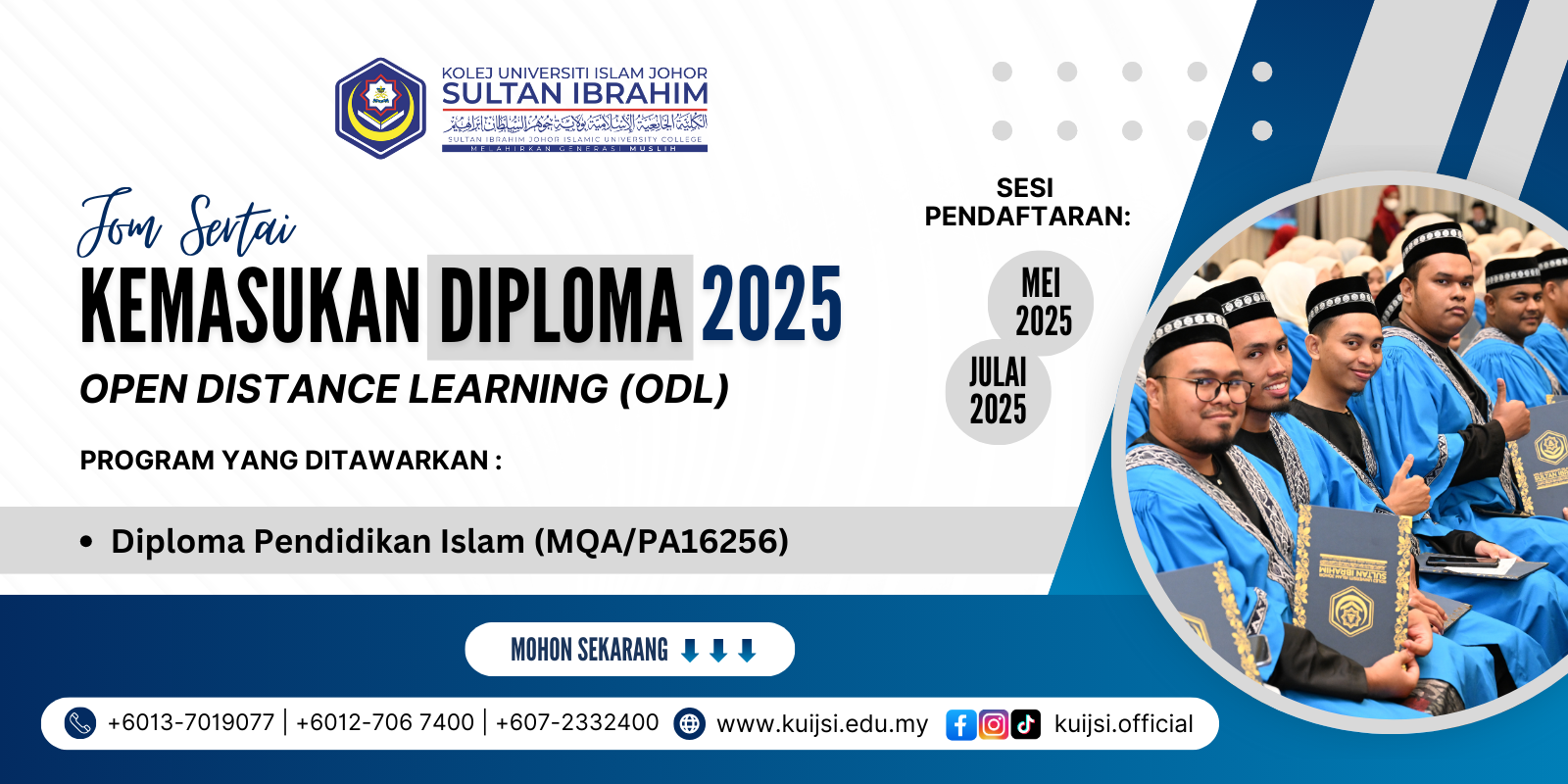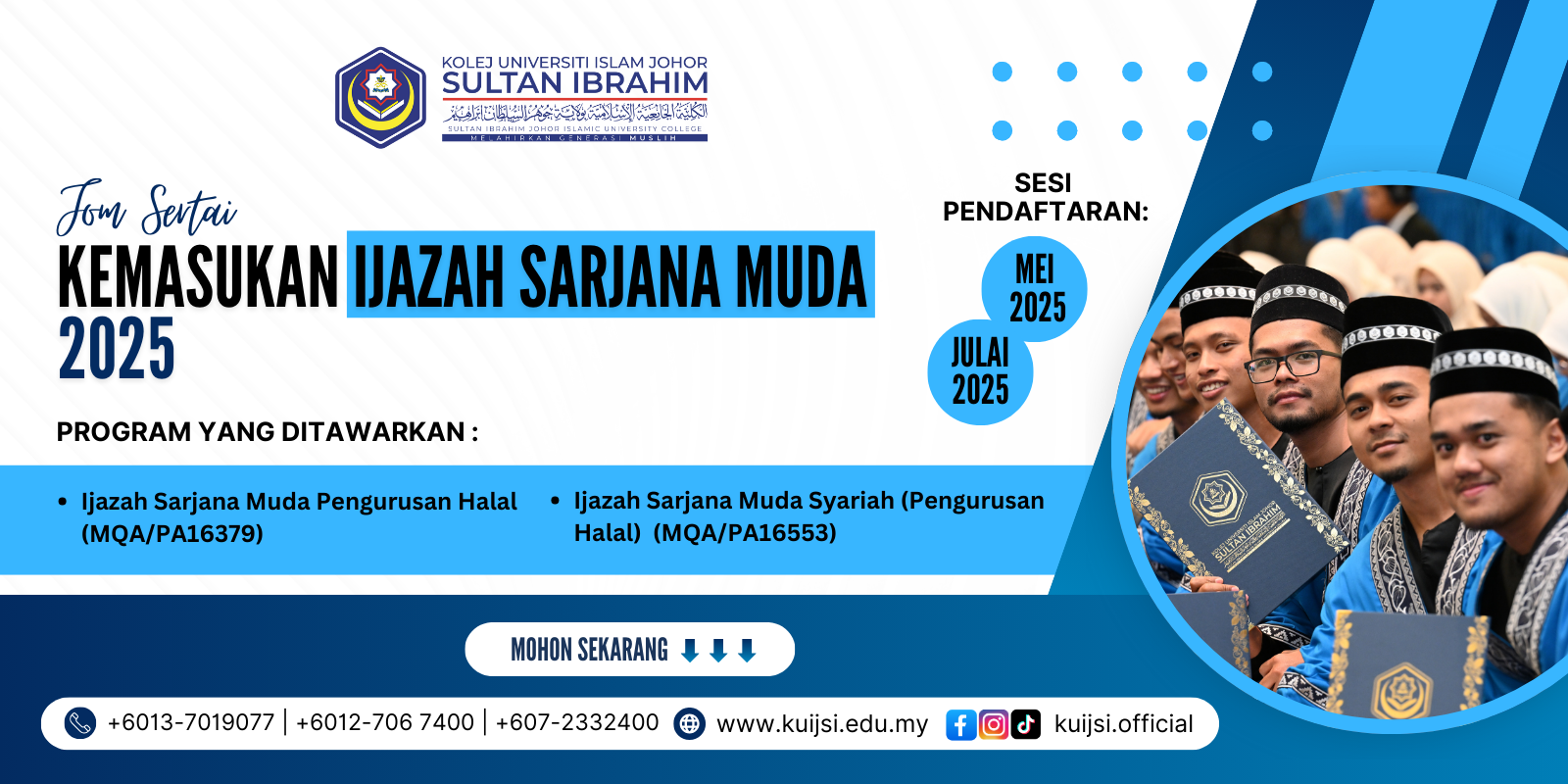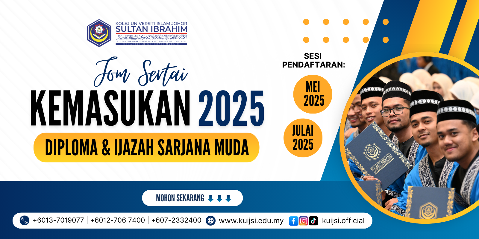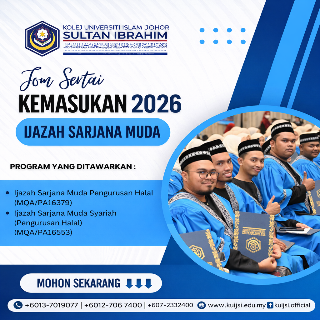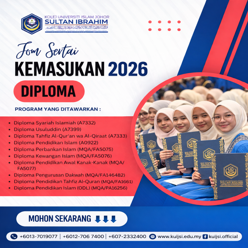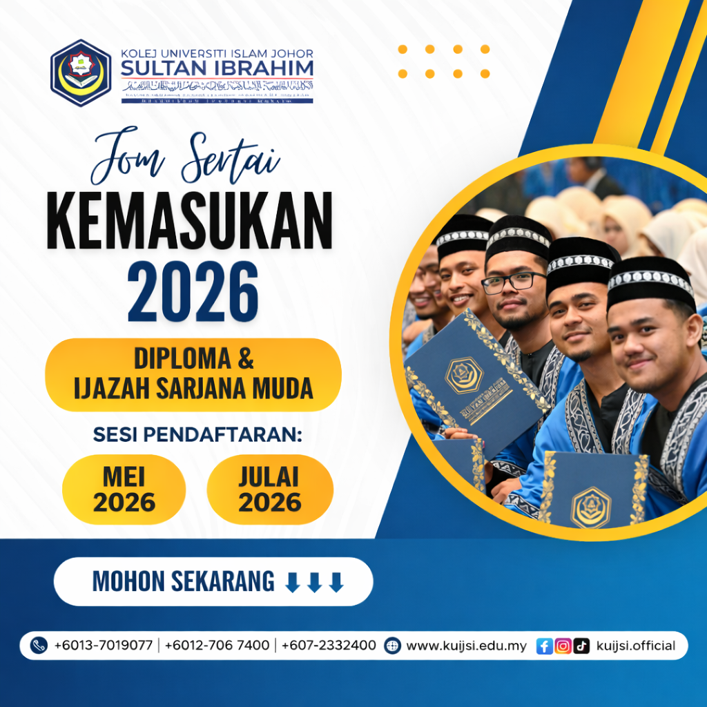 Peluang kini dibuka bagi melanjutkan pengajian ke Kolej Universiti Islam Johor Sultan Ibrahim (KUIJSI) di peringkat Diploma & Ijazah Sarjana Muda.