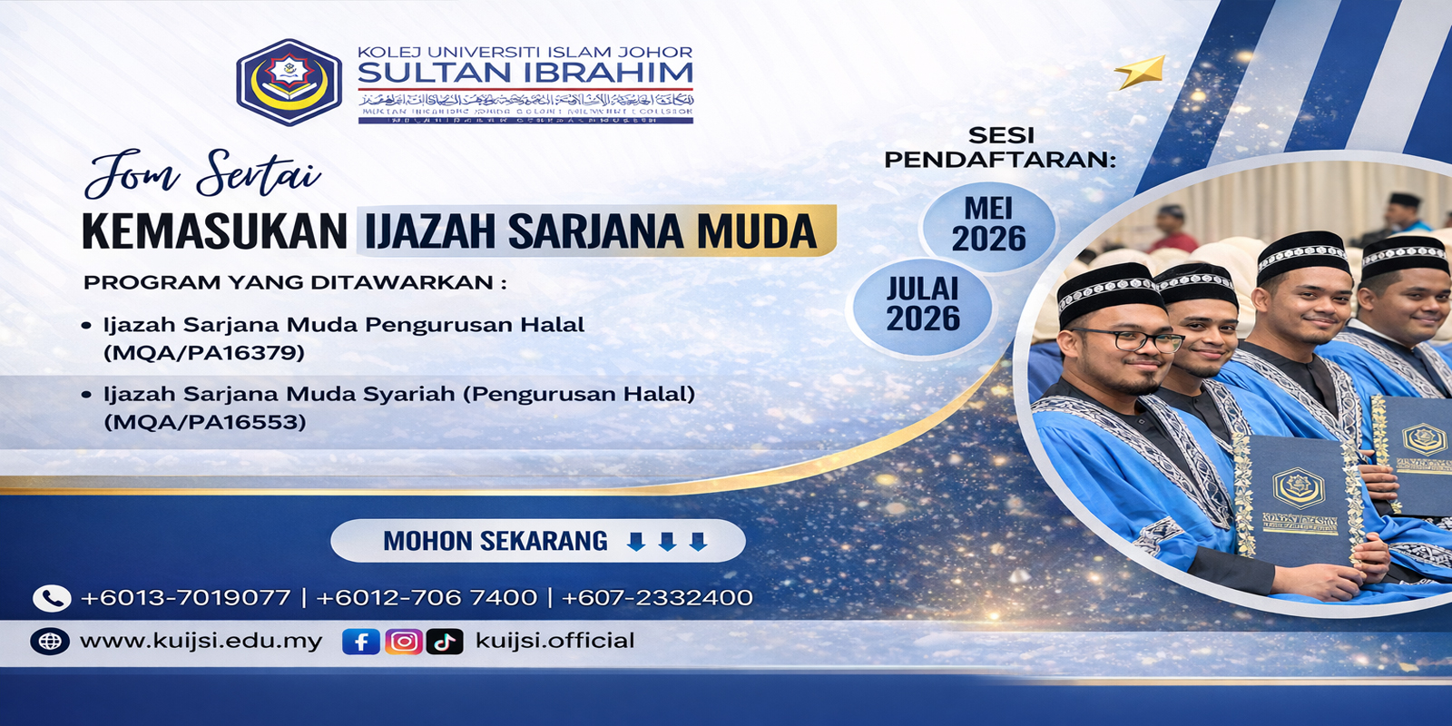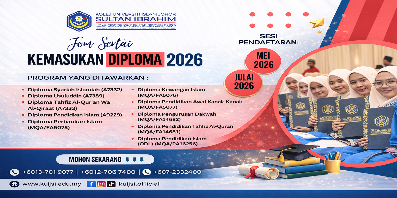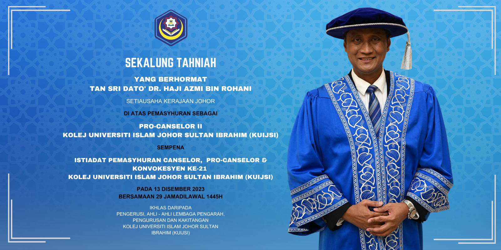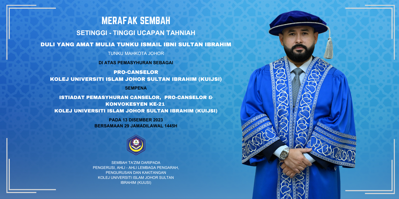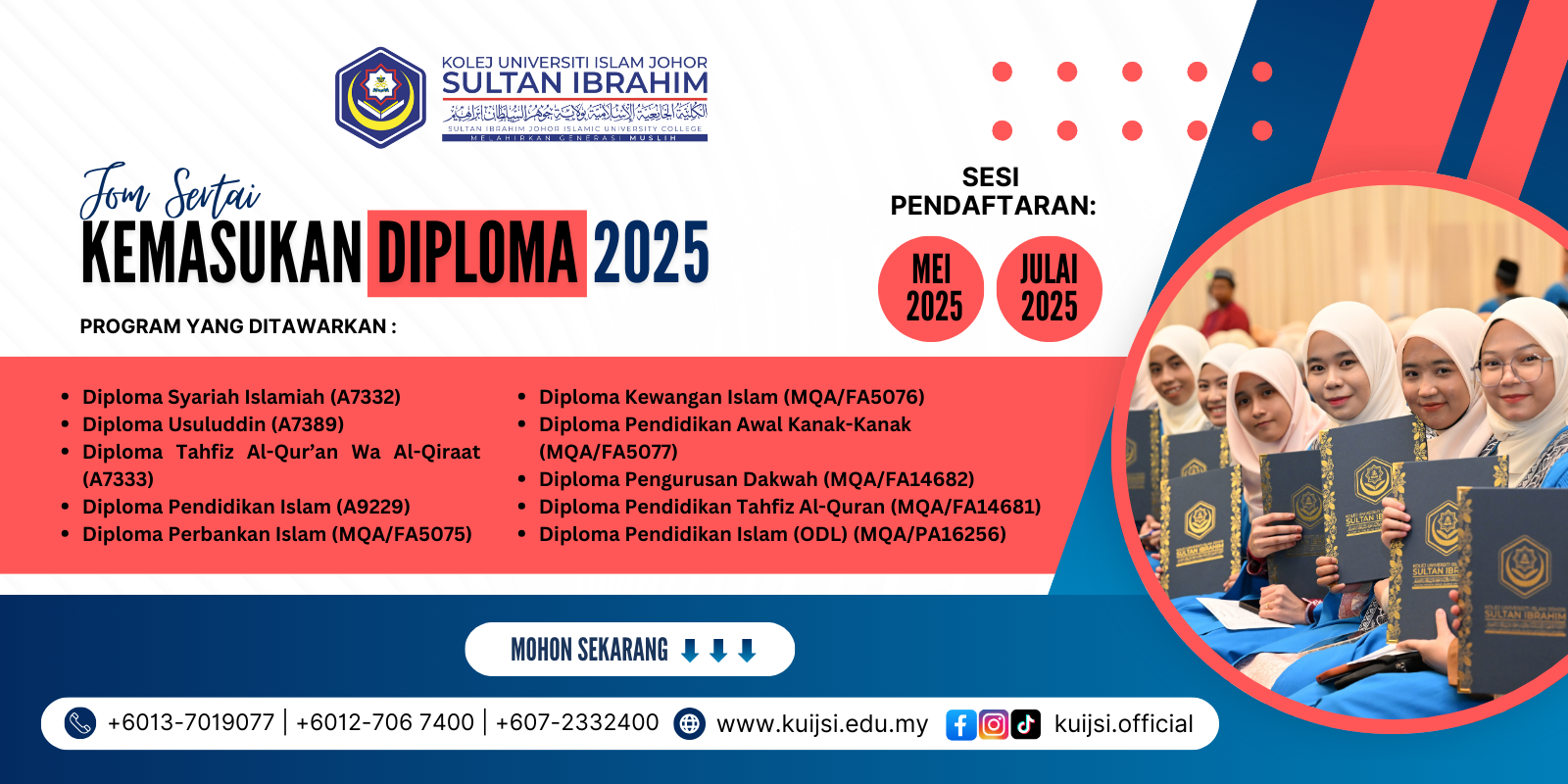 Peluang kini dibuka bagi melanjutkan pengajian ke Kolej Universiti Islam Johor Sultan Ibrahim (KUIJSI) di peringkat Diploma & Ijazah Sarjana Muda.